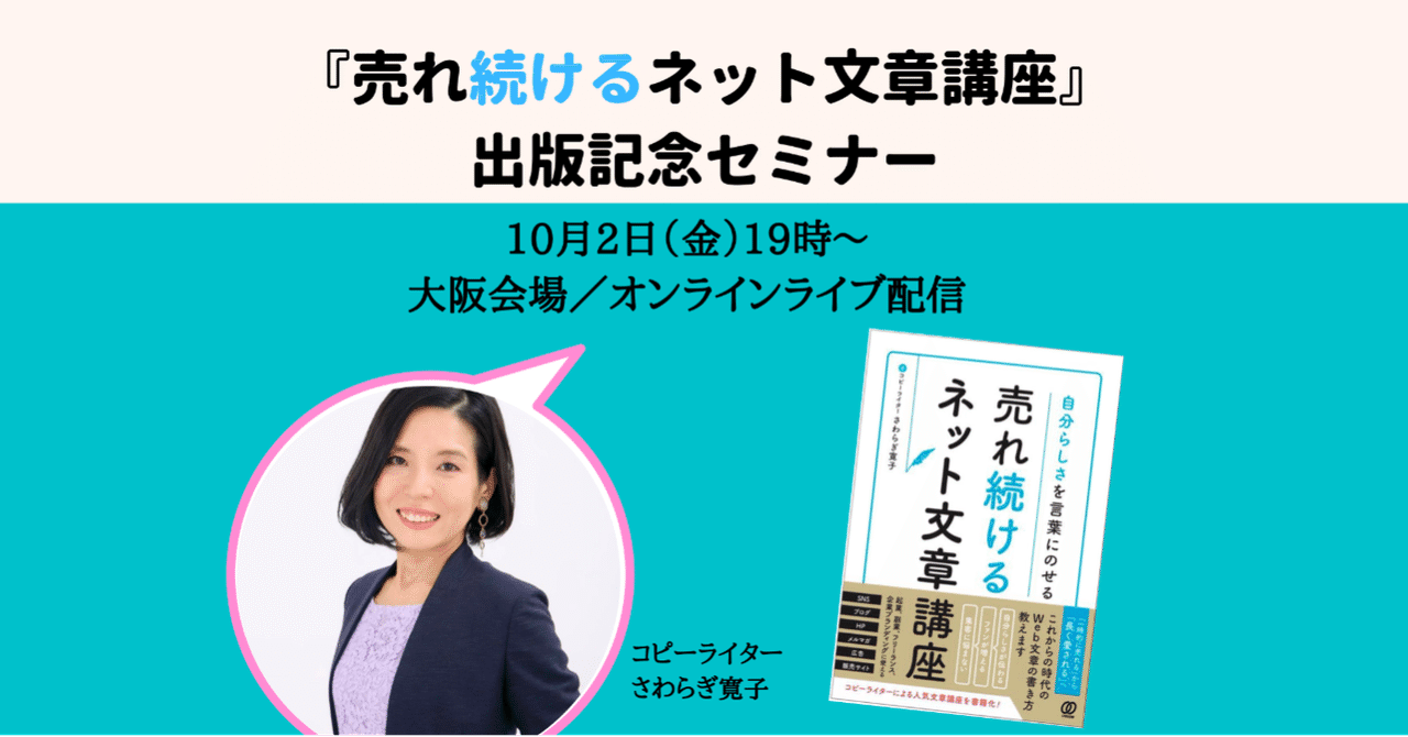 10月2日 金 出版記念セミナー 大阪会場 オンライン 自分らしさを言葉にのせる 売れ続けるネット文章講座 さわらぎ寛子 コピーライター Note